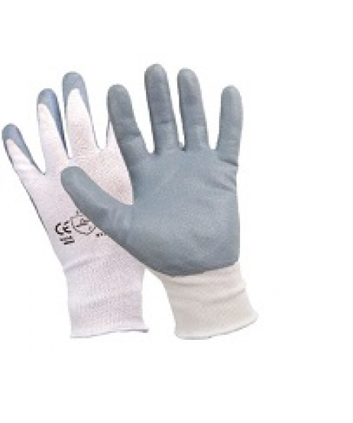 Megztos besiūlės poliesterio pirštinės FF HS-04-001 su elastingu rankogaliu. Delnas aplietas nitrilu, kuris yra atsparus susidėvėjimui, įpjovimams bei įdūrimams ir užtikrina labai gerą sausą sukibimą. Besiūlis mezgimas suteikia ypatingą pirštų galų jautrumą. Tinkamos darbams spaustuvėse, smulkiems surinkimo bei rūšiavimo darbams ir darbams, kur reikalingas geras lytėjimo jautrumas. Taip pat tinkamos automobilių pramonėje darbams su tepalais.MEDŽIAGA: